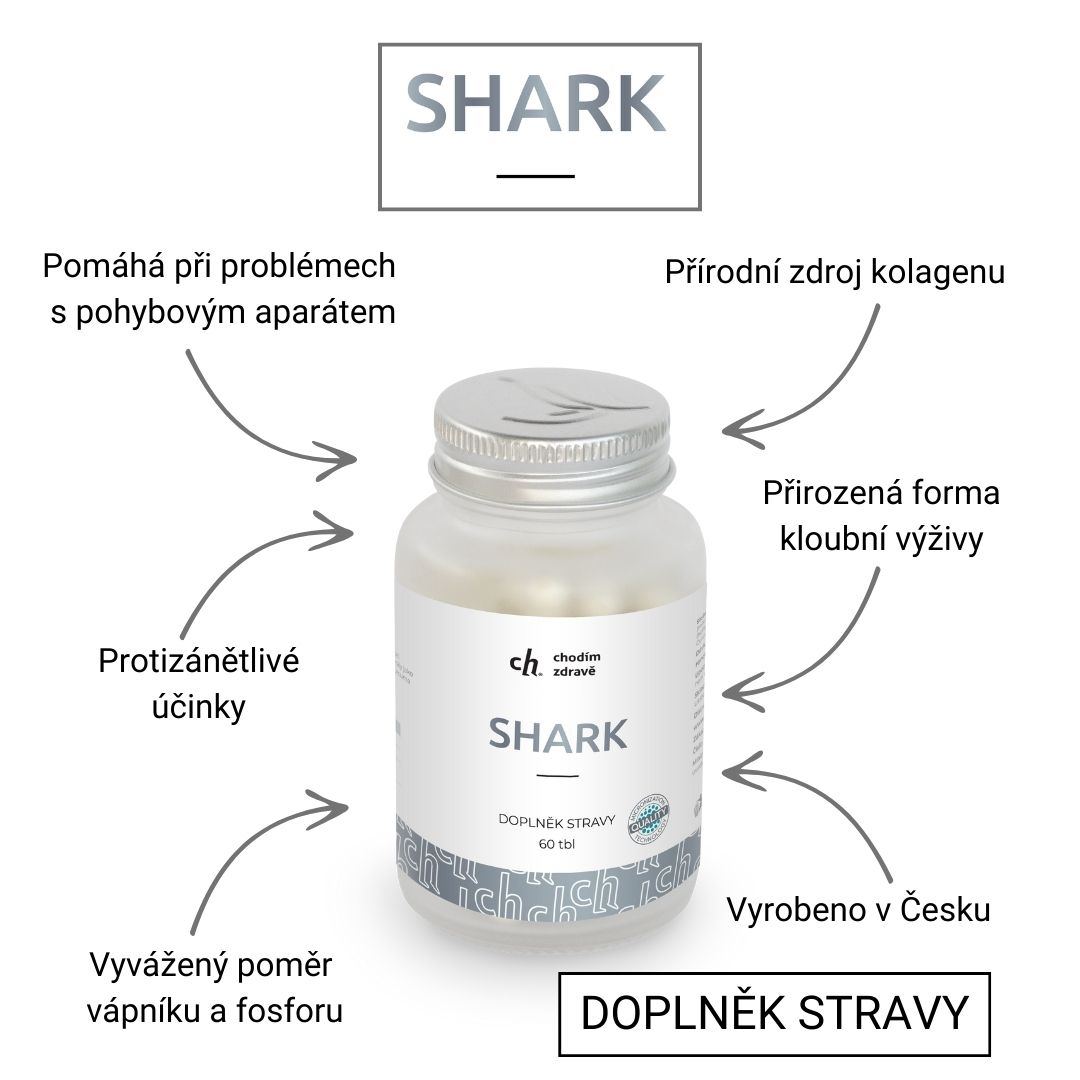 Výrobek SHARK obsahuje 340 mg žraločí chrupavky v každé tobolce, je přírodním zdrojem bílkovin, obsahuje uhlohydráty a potřebné minerály – je bohatým zdrojem vápníku a fosforu. Obsah vápníku a fosforu ve vhodném poměru 2:1 je zde vázán v organické formě, čímž je lépe využitelný pro organismus než přírodní minerály. Tím pomáhá udržovat chrupavky lidských kloubů v dobrém stavu. Vědecké týmy Kanady, Belgie a Švédska dospěly k poznání, že preparáty ze žraločí chrupavky jsou použitelné jak k prevenci, tak i podpůrné léčbě nádorových onemocnění, kde mimo jiné napomáhají posílení imunitního systému. Je rovněž vhodný pro ženy v období klimakteria a seniory.