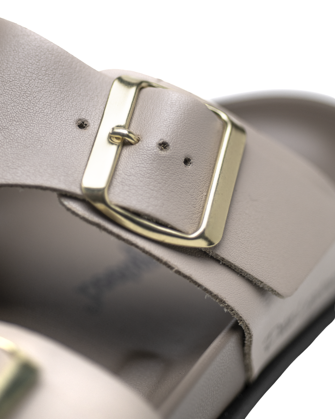 Důležitou součástí je možnost přesného nastavení. Dva nastavitelné pásky s kovovými přezkami umožňují přesné doladění šířky, takže obuv sedí pevně, přirozeně a bez tlaku. Tvarovaná stélka z eko kůže a polyuretanu přináší měkké tlumení při došlapu a gumová podrážka poskytuje stabilitu na různých površích.