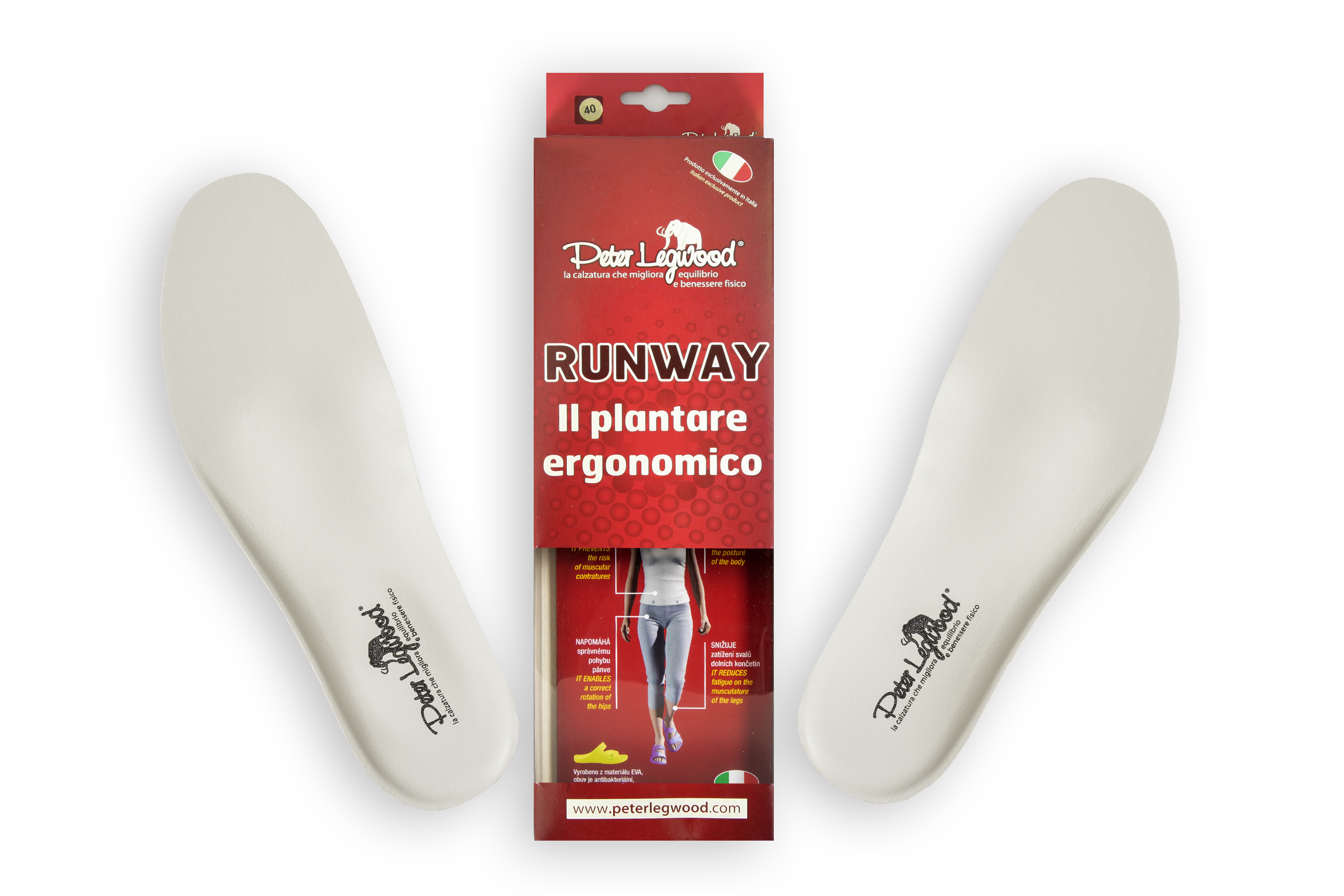 Ergonomické vložky “RUNWAY” jsou vyvinuty na základě systému AEQUOS patentovaného značkou PETER LEGWOOD. Vložky RUNWAY PETER LEGWOOD mají mnoho způsobů využití: v každodenním životě napomáhají k optimálnímu postavení zad a kloubů, při sportu se stává nepostradatelným nástrojem k plnému využití fyzické síly a k snižování poškození vznikajících při intenzivní aktivitě. V neposlední řadě přispívá k rychlejší regeneraci po velké námaze či při vzniku malých poranění.Výrobky Peter Legwood můžete nakoupit jak na eshopu tak v našich partnerských prodejnách, kde si obuv můžete nejen vyzkoušet, ale odborný personál vám ji upraví přímo na míru podle vašeho chodidla.